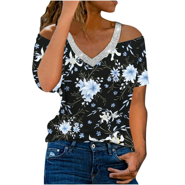 Olyvenn Women S Trendy Tunic T Shirts Deals Comfy Loose Dressy Casual Basics Blouse Clothing 2023 Fashion Summer Off Shoulder Short Sleeve Tees Floral Print Tops Sexy V Neck Shirts Blue 12 Walmart Com